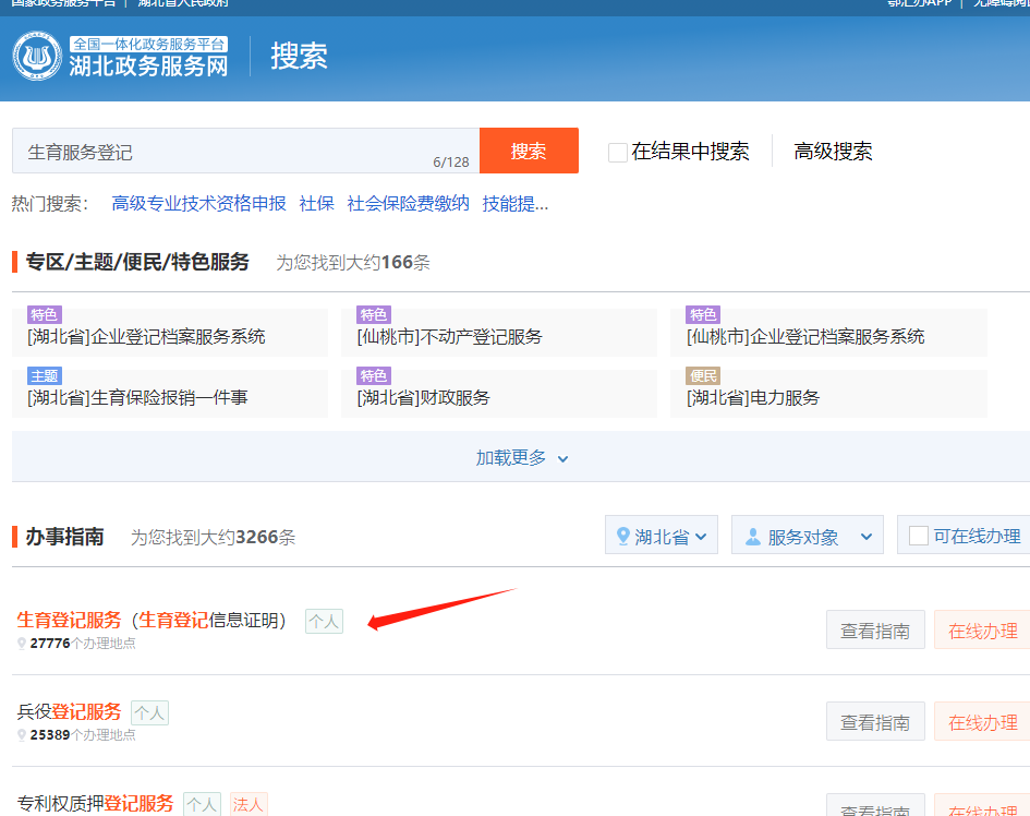3、登錄湖北省政務(wù)服務(wù)網(wǎng)(http://zwfw.hubei.gov.cn/),在主頁上輸入“生育登記服務(wù)”可打開界面,選擇男女雙方任意一方戶籍或者現(xiàn)居住所在地鄉(xiāng)鎮(zhèn)(街道)村居(社區(qū)),便可在線申請,提交相關(guān)材料。