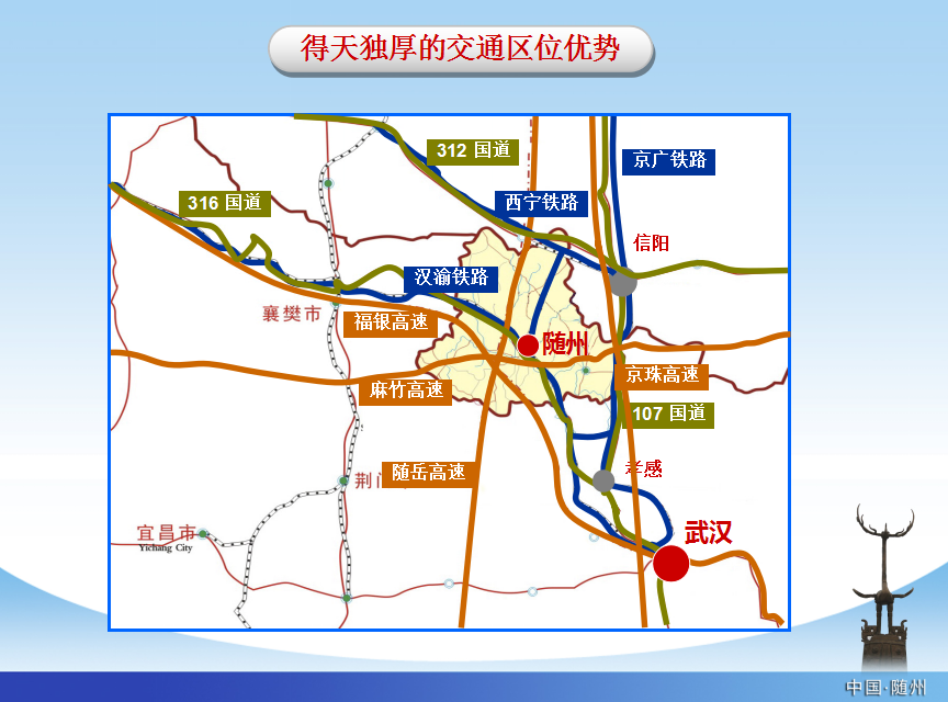 ????? 隨州市位于湖北省北部。地處長江流域和淮河流域的交匯地帶,東承武漢,西接襄樊,北臨信陽,南達荊州,居“荊豫要沖”,扼“漢襄咽喉”,是湖北省對外開放的”北大門”,國家實施西部大開發(fā)戰(zhàn)略由東向西的重要接力站和中轉站。 隨州交通便利,京廣鐵路、武西高鐵、漢渝鐵路、西寧鐵路和107、312、316國道以及”漢十”高速公路、“隨岳”高速公路和“麻竹”高速公路貫穿全境。