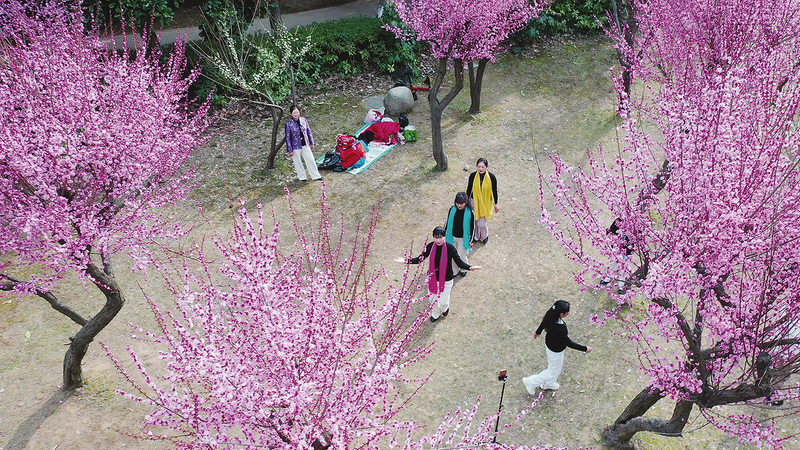 近期園內梅花進入盛花期,吸引眾多市民游客駐足觀賞,或拍照打卡記錄“梅”好時光,或結伴漫步感受自然詩意。一群身著彩衣的游客在梅林間翩躚起舞,衣袂與花枝相映成趣,構成春日里一道靈動風景線。市民李女士表示:“梅花盛開的季節來公園跳舞,既能鍛煉身體,又能欣賞美景,感覺特別愜意。”