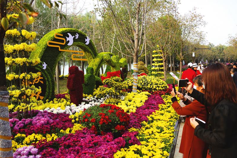 11月8日,以“城鄉融合發展,共建花園城市”為主題的隨州市金秋菊花盆景蘭花展在隨州市櫻花公園展出。爭奇斗艷的菊花吸引市民前往打卡。