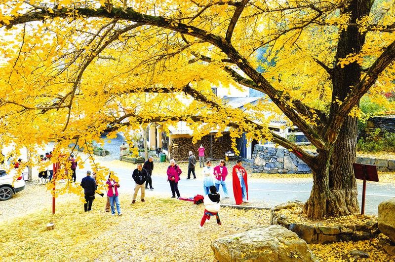 當(dāng)前正值賞銀杏的最好時節(jié),曾都區(qū)洛陽鎮(zhèn)古銀杏群落到處是一片金色的海洋,吸引了省內(nèi)外眾多游客自駕前來觀賞。圖為11月26日,游客在胡家河村觀賞銀杏