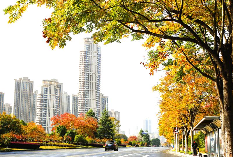 初冬時節,隨州城區層林盡染,法桐、銀杏和欒樹樹葉金黃透亮、鮮艷奪目,將城市裝扮得分外美麗。圖為迎賓大道城區段景觀。