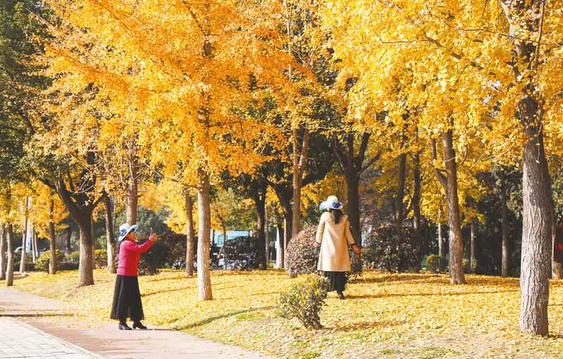 初冬時節,隨州城區層林盡染,銀杏樹葉紛紛飄零,給大地鋪上一層金黃,成為一道靚麗景觀,吸引眾多市民游賞拍照。為挽留美景,市城管執法委園林綠化部門推出“落葉緩清掃”舉措,讓市民更好地領略城市美麗。圖為市民在白云湖大壩口袋公園游玩留影。