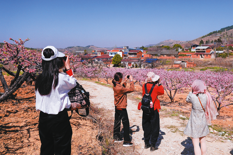桃林間,游客絡繹不絕。有的俯身輕嗅花香,沉醉其中;有的高舉手機,與嬌艷桃花“同框”留念,歡聲笑語在繽紛春色中回蕩。“我們特意從武漢開車過來,一路桃花相伴,美不勝收。這里空氣清新,身處花海,心情格外舒暢,這一趟太值得了!”武漢游客王麗霞滿臉喜悅,興奮地分享著自己的感受。