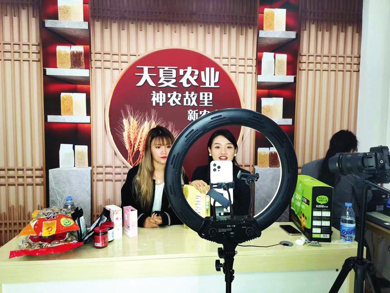 隨縣發揮新的社會階層人士實踐創新基地的引領帶動作用,通過搭建“新農人之家”、“網絡人士之家”等平臺,凝聚電商主播、自由職業者等群體的智慧和力量,助推隨州特色農產品乘“云”出圈。圖為5月6日,在新街鎮天夏農業有限公司電商主播正在向網友推介特色農產品。