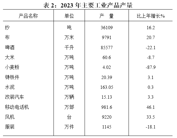 全年全部工業增加值比上年增長4.8%。規模以上工業增加值比上年增長5.5%。在規模以上工業中,分經濟類型看,國有控股企業增加值增長0.6%,股份制企業增長5.7%,外商及港澳臺商投資企業增長5.7%,私營企業增長3.6 %。分門類看,采礦業增長46.5%,制造業增長5.1%,電力、熱力、燃氣及水生產和供應業增長10.1%。