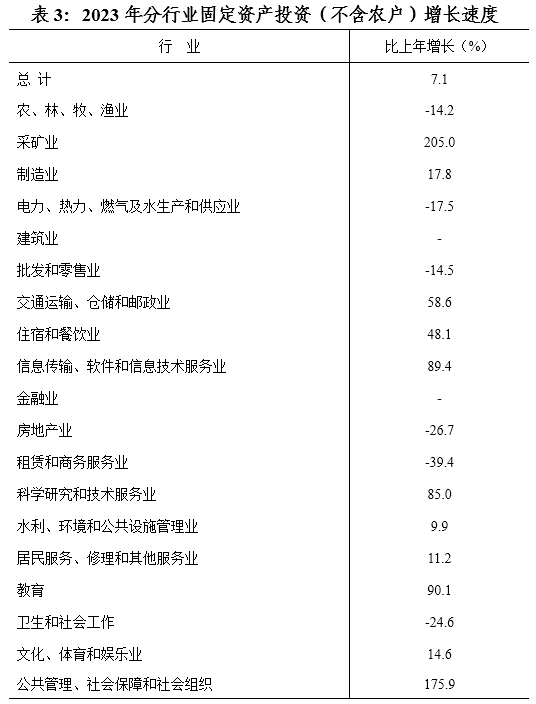 全年固定資產投資(不含農戶)比上年增長7.1%。其中,民間投資下降5.7%。按登記注冊類型劃分,內資企業投資增長8%,港澳臺投資下降37.3%,外商投資下降76.7%,個體經營投資下降22.0%。按產業劃分,第一產業投資下降19.2%,第二產業投資增長14.3%,第三產業投資增長5.5%。其中,房地產開發投資下降33.9%。商品房銷售面積103萬平方米,下降6.4%;銷售額48.6億元,下降9.1%。