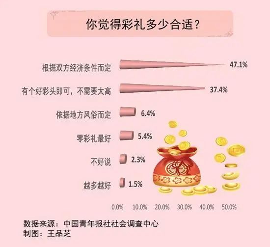 適婚男女談婚論嫁時(shí),“彩禮”是一個(gè)繞不開的話題。彩禮多少合適?彩禮怎么使用?日前,中國(guó)青年報(bào)社社會(huì)調(diào)查中心聯(lián)合問卷網(wǎng),對(duì)1001名受訪者進(jìn)行的一項(xiàng)調(diào)查顯示,47.1%的受訪者認(rèn)為彩禮要根據(jù)雙方經(jīng)濟(jì)條件而定,37.4%的受訪者認(rèn)為有個(gè)好彩頭即可,48.6%的受訪者支持女方將彩禮以陪嫁形式返還小家庭。“大部分地區(qū)在談婚論嫁時(shí)還是有彩禮這個(gè)習(xí)俗的,具體數(shù)額可以雙方協(xié)商,如果女方比較看重,男方也應(yīng)該重視。”南京某公司95后已婚員工王剛認(rèn)為,彩禮也要考慮雙方的經(jīng)濟(jì)情況,如果男方經(jīng)濟(jì)情況不太好,女方也真心準(zhǔn)備兩個(gè)人走下去,那就要考慮對(duì)方的情況,畢竟彩禮只是婚姻中的一部分,兩個(gè)人都用心經(jīng)營(yíng)婚姻更重要。彩禮多少合適?調(diào)查中,47.1%的受訪者認(rèn)為要根據(jù)雙方經(jīng)濟(jì)條件而定,37.4%的受訪者認(rèn)為有個(gè)好彩頭即可,不需要太高,6.4%的受訪者認(rèn)為應(yīng)依據(jù)地方風(fēng)俗而定,5.4%的受訪者覺得“零彩禮”最好,2.3%的受訪者不好說,僅1.5%的受訪者覺得彩禮越多越好。北京某自媒體工作者吳優(yōu)認(rèn)為,彩禮可以根據(jù)當(dāng)?shù)氐亩Y俗來定,如果男女雙方風(fēng)俗不同,就要互相商量。通常女方看重彩禮,主要是希望自己和父母能被重視,但對(duì)女方的尊重不一定體現(xiàn)在彩禮金額上,男方可以通過其他的方式,讓女方家感受到自己的誠(chéng)意。近年來,一些地方不但禮金的金額上漲,禮品的種類也不斷增多,有些地方要求男方有婚房更加重了婚嫁負(fù)擔(dān)。吳優(yōu)說,相比于彩禮的金額,自己更看重有意義的物品。“有同事結(jié)婚時(shí)收到了婆婆送的鐲子,是新郎的奶奶傳下來的,同事打算以后再傳給下一代。我覺得這樣的禮物就非常有意義。”彩禮怎么使用?調(diào)查中,48.6%的受訪者支持女方以陪嫁形式返還小家庭,37.9%的受訪者建議成為新娘的私人財(cái)產(chǎn),11.7%的受訪者認(rèn)為可贈(zèng)予女方父母等家庭成員。北京某高校00后研究生馬辰覺得年輕人面對(duì)婚姻時(shí),應(yīng)該有自己的想法和思考,不應(yīng)該被彩禮的數(shù)目羈絆。年輕人在接受彩禮習(xí)俗的同時(shí),也要認(rèn)識(shí)到彩禮的禮儀之義,認(rèn)真思考彩禮的用途,讓它成為情感升溫的催化劑。馬辰覺得,彩禮比較好的使用方式是返還一部分或全部給小家庭。王剛覺得目前存在的“高價(jià)彩禮”是一個(gè)相對(duì)棘手的問題,彩禮有較長(zhǎng)的歷史,現(xiàn)在又衍生出經(jīng)濟(jì)需求,治理“高價(jià)彩禮”,強(qiáng)制要求可能未必有效,需盡量宣傳“低彩禮”甚至“零彩禮”的案例,引導(dǎo)有影響力的家庭帶頭,同時(shí)發(fā)揮影視劇、文藝作品、短視頻等的影響力,從普通人的視角出發(fā),用貼近大家生活的方式循循善誘,幫助大家轉(zhuǎn)變觀念。“改變觀念需要整個(gè)社會(huì)環(huán)境的改變。如果只有少數(shù)人強(qiáng)調(diào)‘低彩禮’,現(xiàn)實(shí)中會(huì)受到比較大的阻力。當(dāng)身邊越來越多人都不再看重彩禮的金額時(shí),個(gè)體也更容易在生活中踐行文明婚俗。歸根結(jié)底,還是需要整個(gè)社會(huì)風(fēng)氣的轉(zhuǎn)變。”馬辰說。受訪者中,男性占38.3%,女性占61.7%。00后占22.3%,95后占22.7%,90后占33.4%,85后占12.6%,80后占9.0%。一線城市的占30.2%,二線城市的占39.0%,三四線城市的占22.0%,縣城的占4.6%,農(nóng)村的占4.2%。(王榮慧對(duì)此文亦有貢獻(xiàn)。應(yīng)采訪對(duì)象要求,吳優(yōu)為化名)