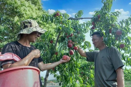 湖北省廣水市郝店鎮鐵城村鄉村合作公司聘請村民采摘胭脂紅桃。團廣水市委供圖