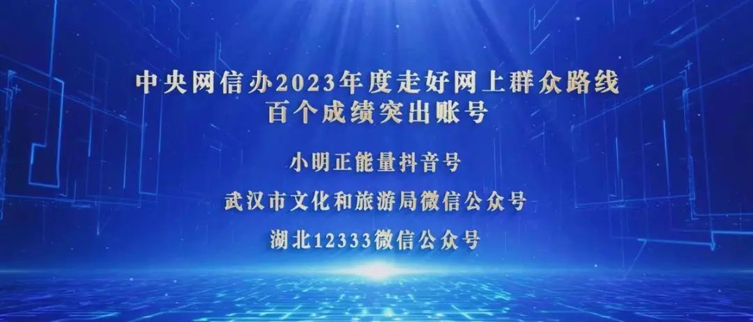 由中央網信辦主辦的“2023年走好網上群眾路線百個成績突出賬號推選活動”中,湖北有三個賬號獲獎,分別是小明正能量抖音號、武漢市文化和旅游局微信公眾號、湖北12333微信公眾號。