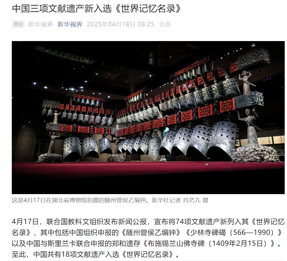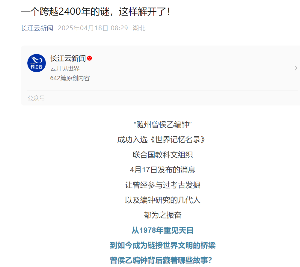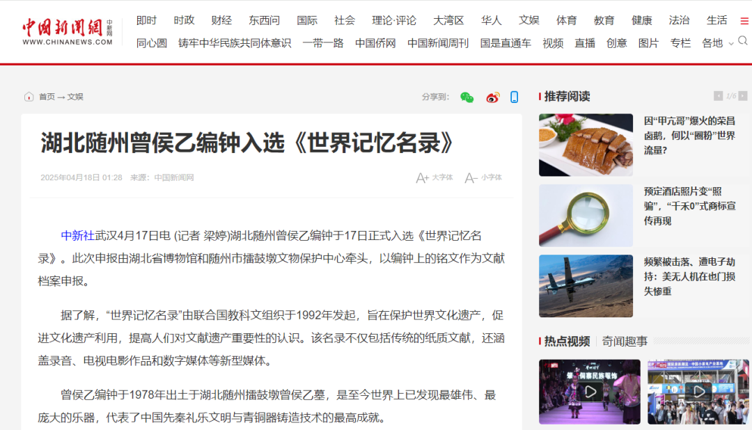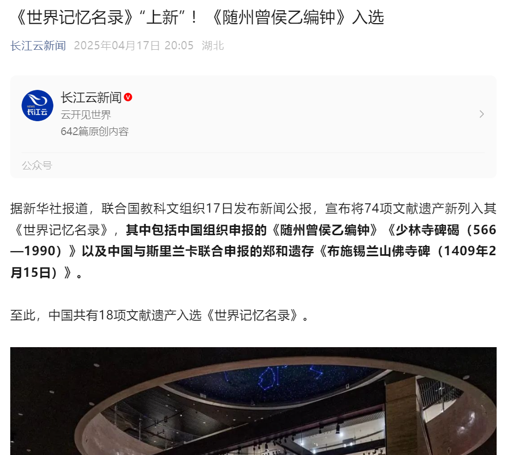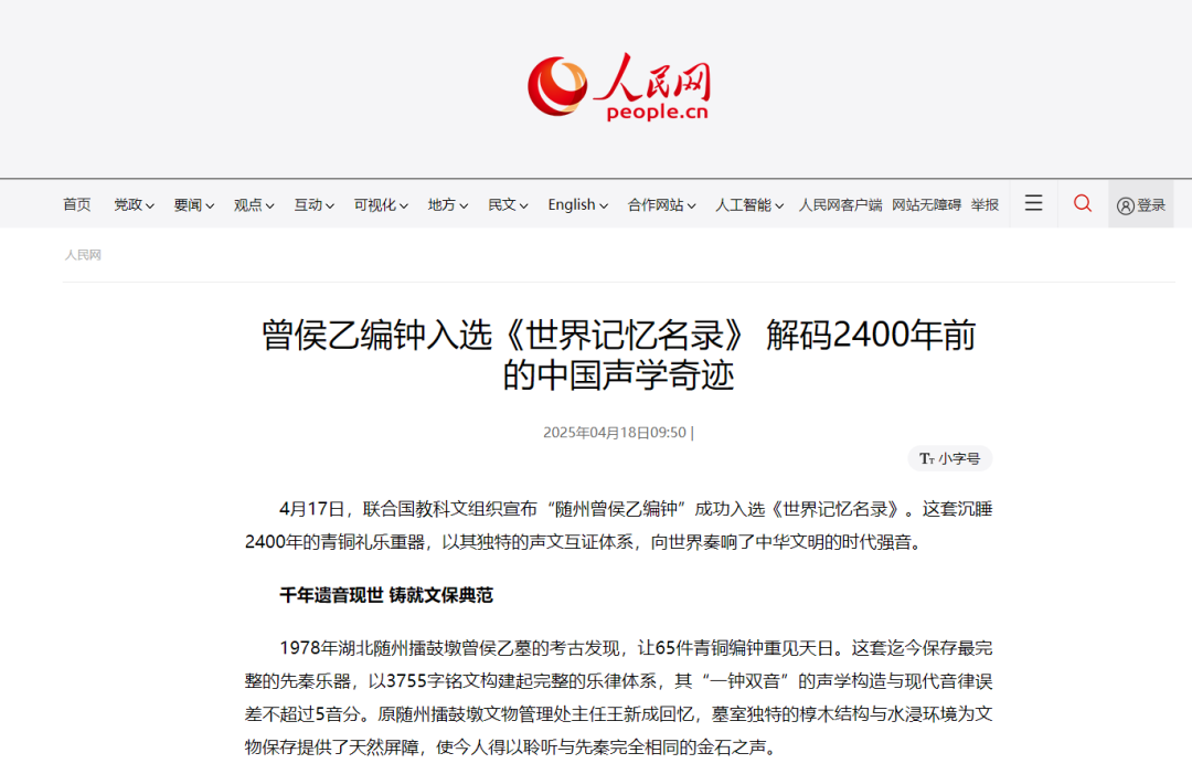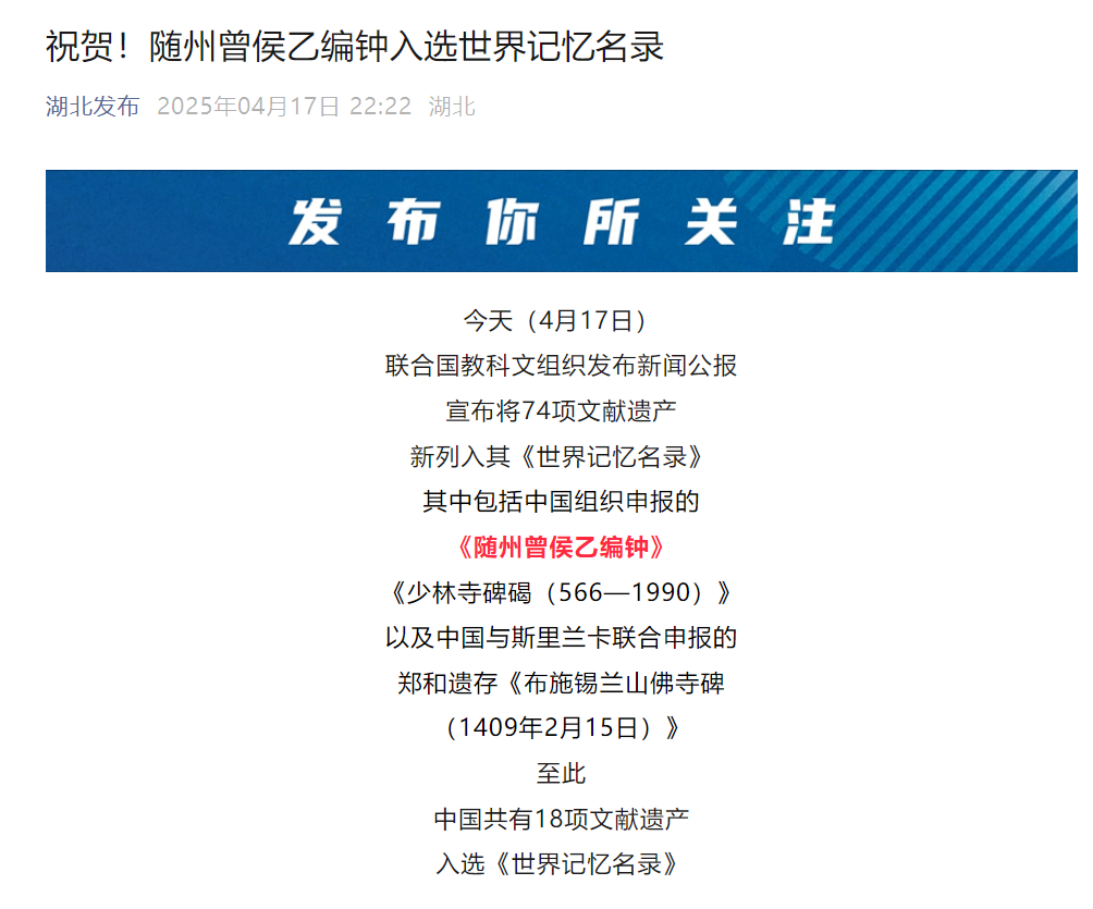 專(zhuān)家認(rèn)為,隨州曾侯乙編鐘是人類(lèi)目前所見(jiàn)最早體現(xiàn)音樂(lè)數(shù)理關(guān)系的出土文獻(xiàn),是迄今所知公元前5世紀(jì)全世界唯一的有聲文獻(xiàn),是目前世界僅存的公元前5世紀(jì)聲文對(duì)應(yīng)的樂(lè)律文獻(xiàn),是人類(lèi)軸心時(shí)代高度發(fā)達(dá)的抽象思維能力的見(jiàn)證。隨州曾侯乙編鐘的入選填補(bǔ)了湖北省《世界記憶(國(guó)際)名錄》空白。