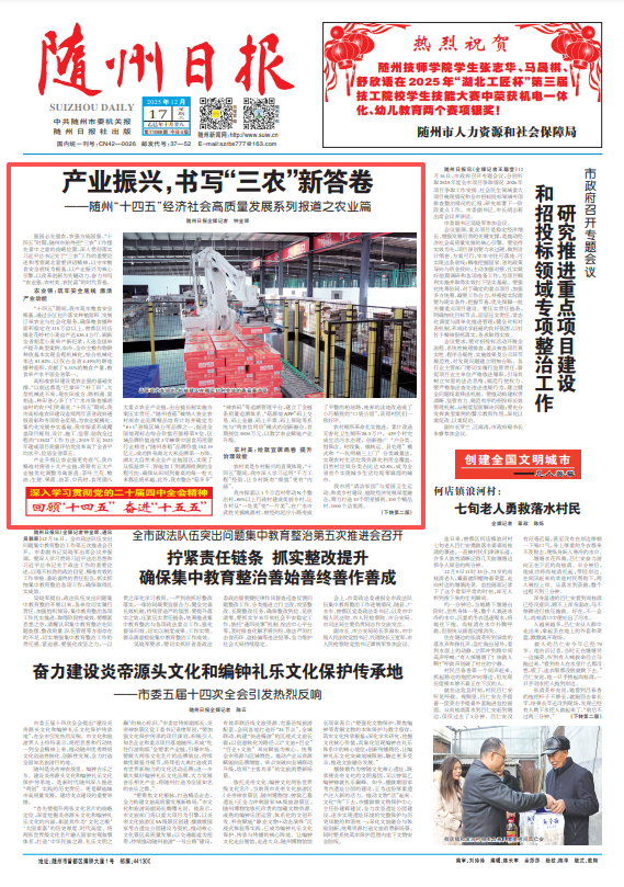 今年是“十四五”規(guī)劃收官之年,高質(zhì)量完成“十四五目標(biāo)任務(wù),為實(shí)現(xiàn)“十五五”良好開(kāi)局打牢基礎(chǔ),意義重大。為全面展現(xiàn)全市上下牢牢把握發(fā)展定位,統(tǒng)籌發(fā)展與安全,推動(dòng)“十四五”規(guī)劃落地見(jiàn)效的生動(dòng)實(shí)踐和亮點(diǎn)成果,同時(shí)反映我市各地各部門(mén)深入學(xué)習(xí)貫徹黨的二十屆四中全會(huì)精神,科學(xué)謀劃“十五五”發(fā)展的思路舉措,隨州日?qǐng)?bào)推出“回顧十四五、奮進(jìn)十五五”系列報(bào)道,敬請(qǐng)關(guān)注。