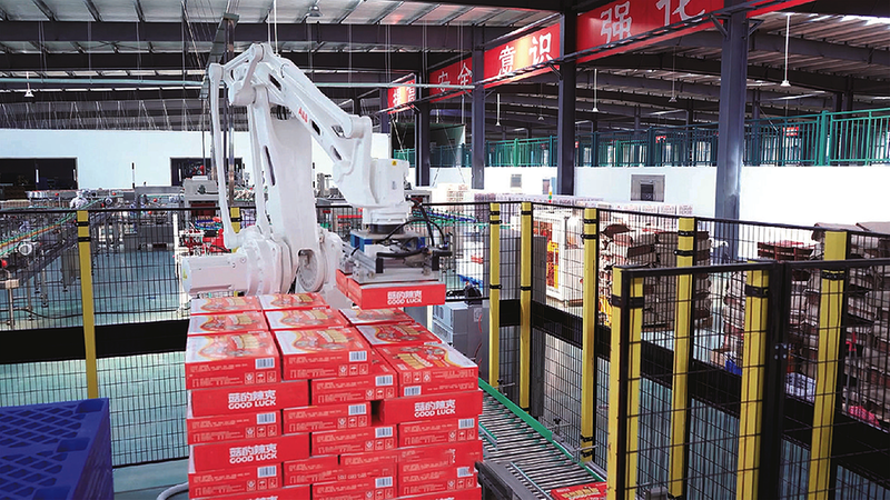 品源現(xiàn)代車(chē)間內(nèi),機(jī)械臂正在搬運(yùn)打包完畢的香菇醬產(chǎn)品
