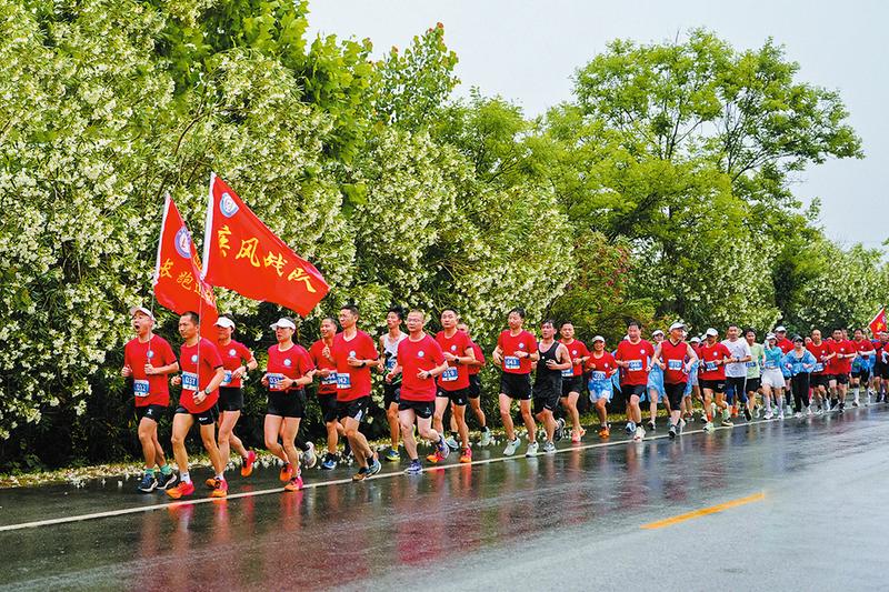 5月26日,我市長跑運動協會開展慶尋根節健康長跑活動。當天,我市近200名長跑健身愛好者參加了從隨州博物館廣場到炎帝故里風景名勝區全長18公里的長跑活動。圖為長跑健身愛好者正冒雨跑在炎帝大道上。