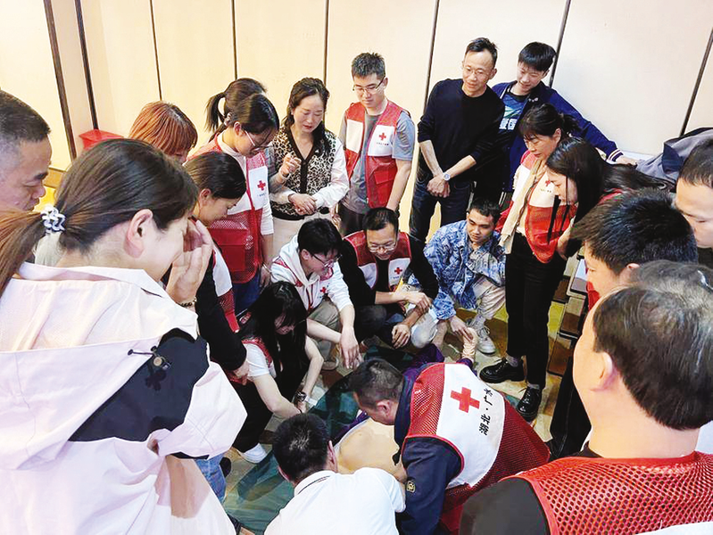 近期,廣水市紅十字會舉辦了兩期初級救護(hù)員培訓(xùn)班。培訓(xùn)教師借助模擬人和 AED 現(xiàn)場演示心肺按壓、人工呼吸的正確手法,借助繃帶、三角巾等教具讓參訓(xùn)學(xué)員了解在止血包扎時如何做到“快、準(zhǔn)、穩(wěn)”,避免患者受到二次傷害。