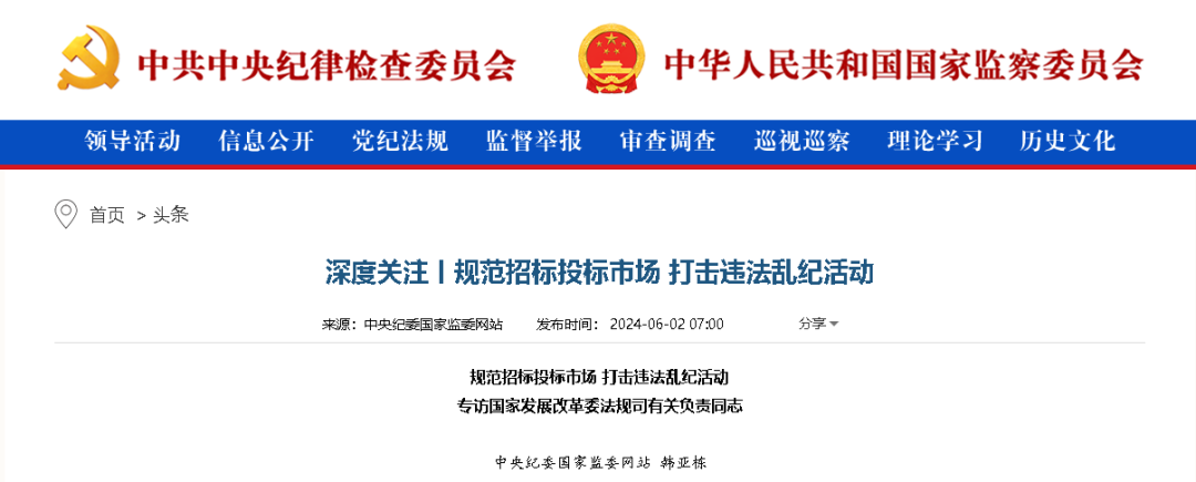 6月2日,中央紀委國家監委網站發布文章《規范招標投標市場 打擊違法亂紀活動》,通過專訪國家發展改革委法規司有關負責同志,剖析了當前招投標領域突出矛盾和問題及背后深層次原因,并提出如何從體制機制層面予以破解。