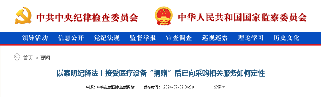 7月3日,中央紀委國家監委網站發布文章《接受醫療設備“捐贈”后定向采購相關服務如何定性》,以典型案例方式分析“捐贈”后的定向采購的定性問題。