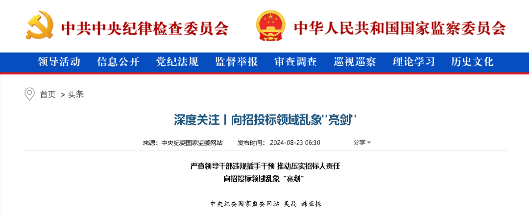 8月23日,中央紀委國家監委網站發布文章《向招投標領域亂象“亮劍”》,嚴查領導干部違規插手干預招投標、明招暗定、圍標串標等問題,強調要壓實招標人主體責任,促進招投標規范管理。