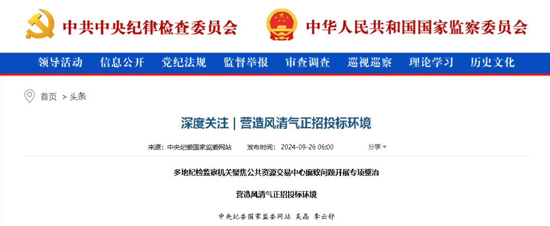 9月26日,中央紀委國家監委網站發布文章《營造風清氣正招投標環境》,文章指出,公共資源交易中心是參與公共資源交易全過程的機構,存在涉及交易面廣、投資密集、資源集中等特點,是廉潔風險集中的重點領域。公共資源交易中心要做到從源頭預防、系統治理,營造風清氣正的招投標環境。