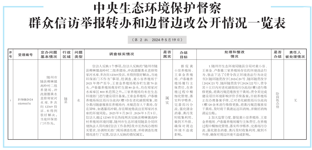 中央生態環境保護督察群眾信訪舉報轉辦和邊督邊改公開情況一覽表