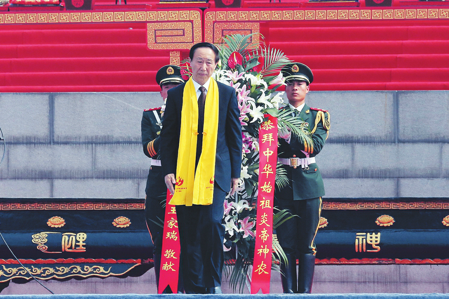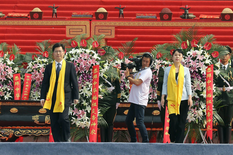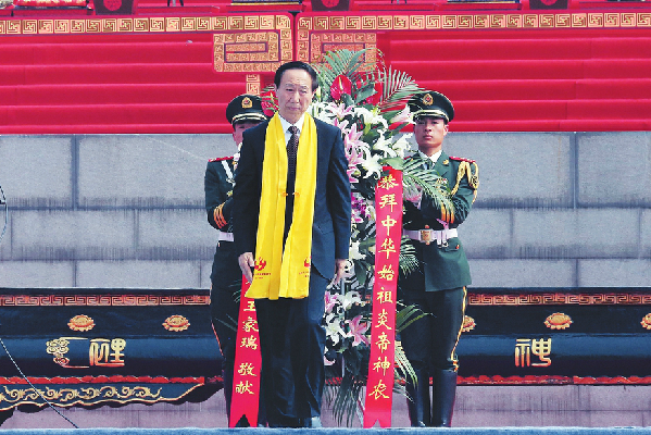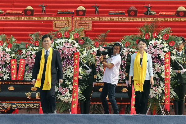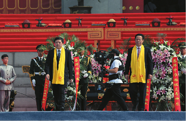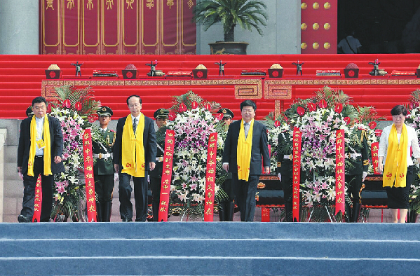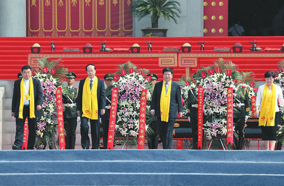 ? ? 國務院臺灣事務辦公室副主任龍明彪、中國文聯副主席左中一、中華全國歸國 ? 華僑聯合會副主席康曉萍、中華炎黃文化研究會常務副會長常文光敬獻花籃
