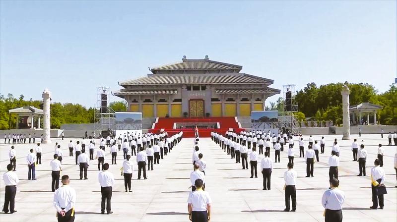 5月18日(農(nóng)歷四月二十六)上午,庚子年世界華人炎帝故里尋根節(jié)暨拜謁炎帝神農(nóng)大典在隨州炎帝故里謁祖廣場舉行,海內(nèi)外炎黃子孫通過直播,共賀炎帝誕辰。圖為拜祖大典現(xiàn)場。