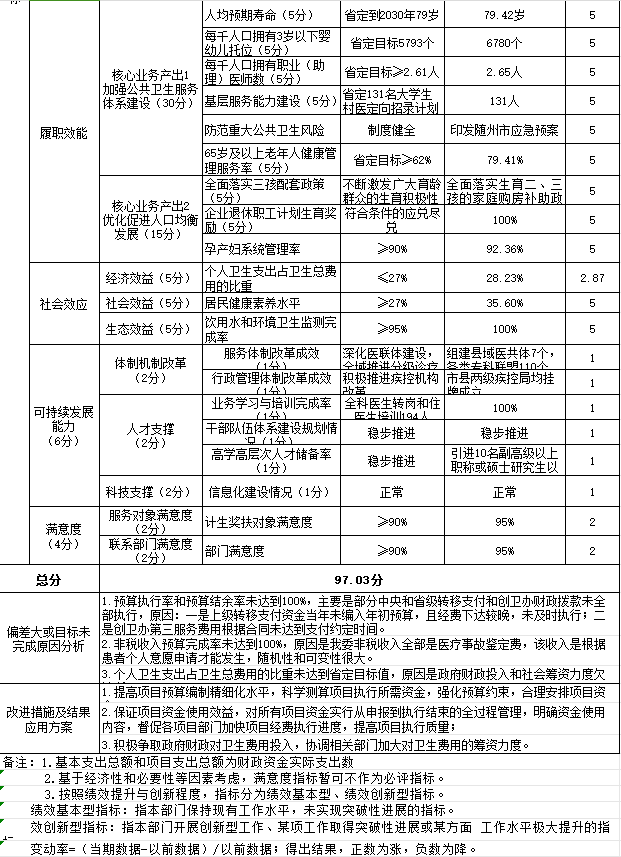 從評價情況來看,隨州市衛(wèi)生健康委整體支出績效目標基本實現(xiàn),績效自評得分97.03分,績效等級為優(yōu)。