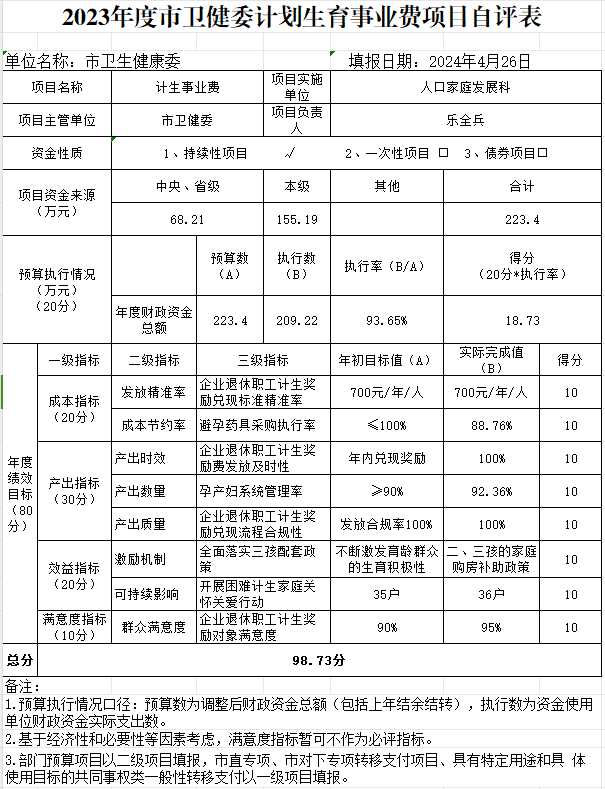 《2023年度市衛(wèi)健委計劃生育事業(yè)費項目自評表》附后