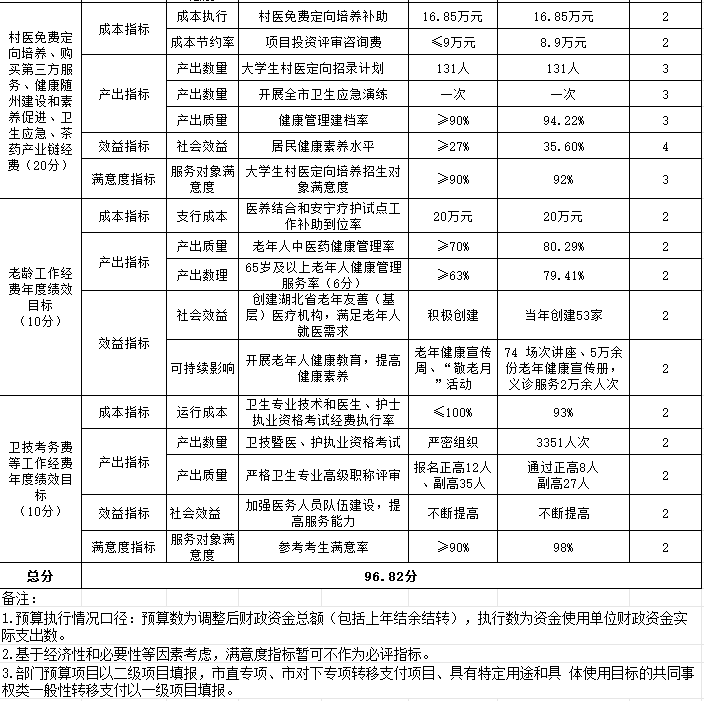 2.衛(wèi)生業(yè)務(wù)類支出項目績效自評綜述:本項目內(nèi)含六個子項目,因六個項目經(jīng)費額度都不大,因此一并統(tǒng)籌進行績效自評。項目全年預(yù)算數(shù)為218.9萬元,其中:本級財政撥款82.6萬元,上級轉(zhuǎn)移支付收入88.42萬元,其他收入47.88萬元;實際執(zhí)行184.13萬元,執(zhí)行率84.12%。主要產(chǎn)出和效益:一是職業(yè)健康和職業(yè)病防治項目經(jīng)費預(yù)算執(zhí)行率達100%,二是村醫(yī)免費定向培養(yǎng)補助成本執(zhí)行100%,三是項目投資評審咨詢費成本節(jié)約率0.1%,四是醫(yī)養(yǎng)結(jié)合和安寧療護試點工作補助到位率100%,五是衛(wèi)生技術(shù)和醫(yī)生、護士執(zhí)業(yè)資格考試經(jīng)費很好的貫徹落實了中央和省市“過緊日子”的工作要求,六是職業(yè)健康監(jiān)測、全科醫(yī)生轉(zhuǎn)崗、助理全科醫(yī)生培訓(xùn)、健康企業(yè)創(chuàng)建工作完成省定目標,七是完成當年招收村醫(yī)免費定向培養(yǎng)大學(xué)生計劃131人,八是老年人中醫(yī)藥健康管理率和65歲及以上老年人健康管理服務(wù)率超額完成省定目標,九是創(chuàng)建重點專科8個。發(fā)現(xiàn)的問題及原因:一是預(yù)算執(zhí)行率未達到100%,二是績效自評指標和年初目標值不一致;原因是部分項目為延續(xù)項目和結(jié)合當年工作、考核要求重新設(shè)置了指標值。下一步改進措施:一是加強預(yù)算執(zhí)行力度,確保資金使用進度,強化資金使用及時,有力保障資金效益;二是在預(yù)算目標設(shè)定時,力求結(jié)合目標任務(wù)和工作計劃全面、科學(xué)、精準、規(guī)范。