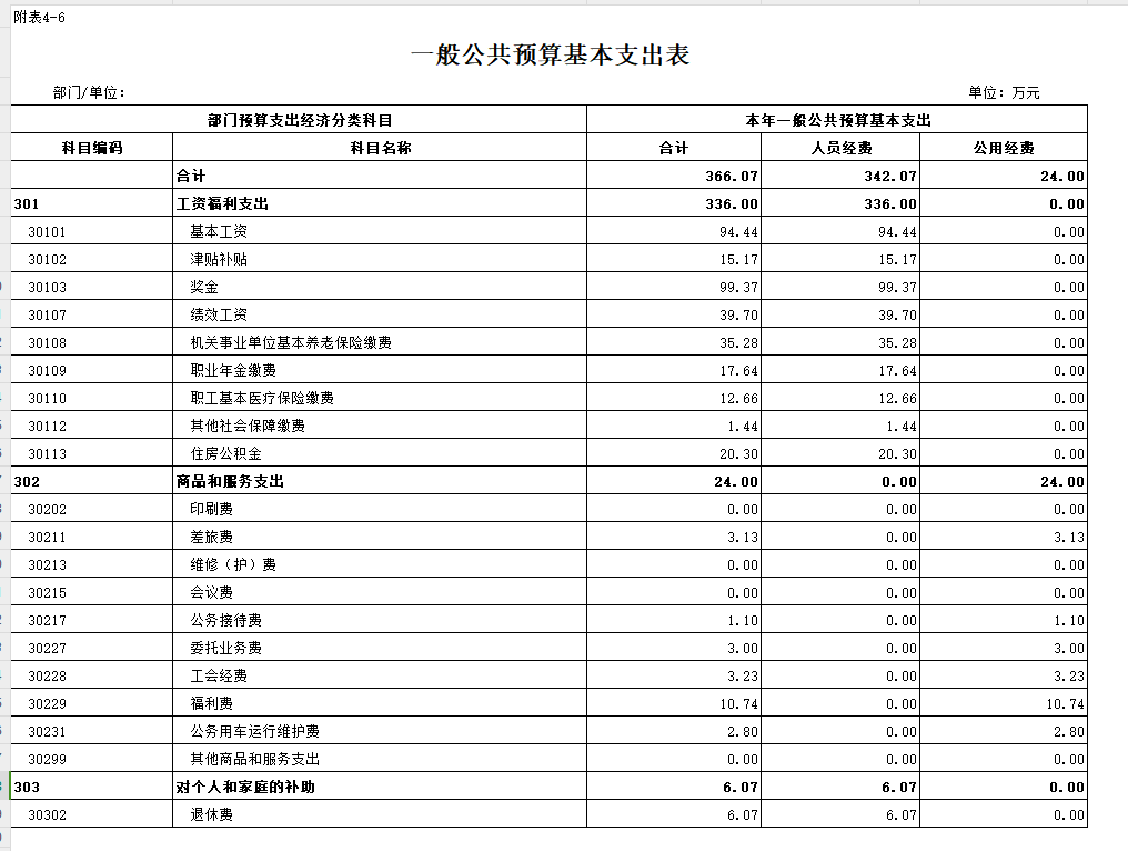 按支出功能分類:社會保障與就業支出60.72萬元,較2023年32.14萬元增加28.58萬元,增加率88.92%,增加原因為社保繳費增加;衛生健康支出371.18萬元,較2023年381萬元減少9.82萬元,減少率為2.6%,減少原因為減少衛生監測經費項目支出;住房保障支出24.17萬元,較2023年25.06萬元減少0.89萬元,減少率為3.56%,減少原因為人員退休減少住房公積金。