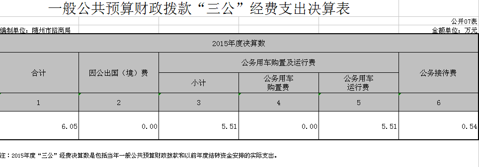 ????2015年度“三公”經(jīng)費(fèi)財(cái)政撥款決算6.05萬(wàn)元,較上年減少0.3萬(wàn)元。其中,因公出國(guó)(境)費(fèi)0萬(wàn)元,公務(wù)用車購(gòu)置及運(yùn)行費(fèi)5.51萬(wàn)元,減少0.19萬(wàn)元,公務(wù)接待費(fèi)0.54萬(wàn)元,減少0.11萬(wàn)元。主要是招商活動(dòng)減少,進(jìn)一步壓縮公務(wù)支出。