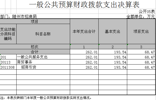 2015年度財(cái)政撥款收入支出總計(jì)262.01萬(wàn)元,與上年相比減少39.46萬(wàn)元,主要原因是2015年招商活動(dòng)、招商經(jīng)費(fèi)減少。