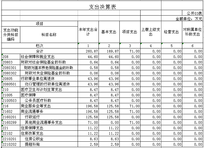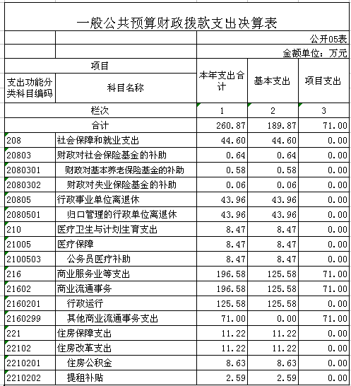 2015年財政撥款支出決算260.87萬元。其中:基本支出189.87萬元,用于單位正常運轉的支出;項目支出71萬元,用于新農村現代流通網絡建設工程等項目經費的支出。