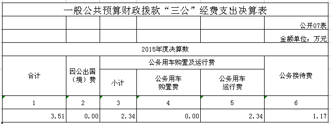 2015年“三公”經費支出3.51萬元,其中公務接待費1.17萬元,公車運行費2.34萬元。,比2014年支出增加1.45萬元。增加原因:主要為公車購買時間年限增長,保養費用增加。