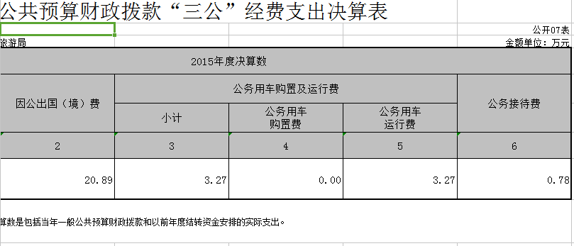 (4)三公經(jīng)費(fèi)支出19.14萬元。其中因公出國(境)費(fèi)15.39萬元(未含曾云峰同志參加的旅游推廣交流活動費(fèi)用5.5萬元),公務(wù)用車運(yùn)行維護(hù)費(fèi)2.97萬元,公務(wù)接待費(fèi)0.78萬元。