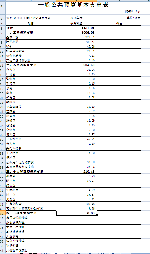 2015年支出1846.85萬元,其中工資福利支出1017.53萬元,商品和服務(wù)支出204.62萬元,項目支出156.57萬元,對個人和家庭補助支出210.49萬元,其他資本性支出257.64萬元。