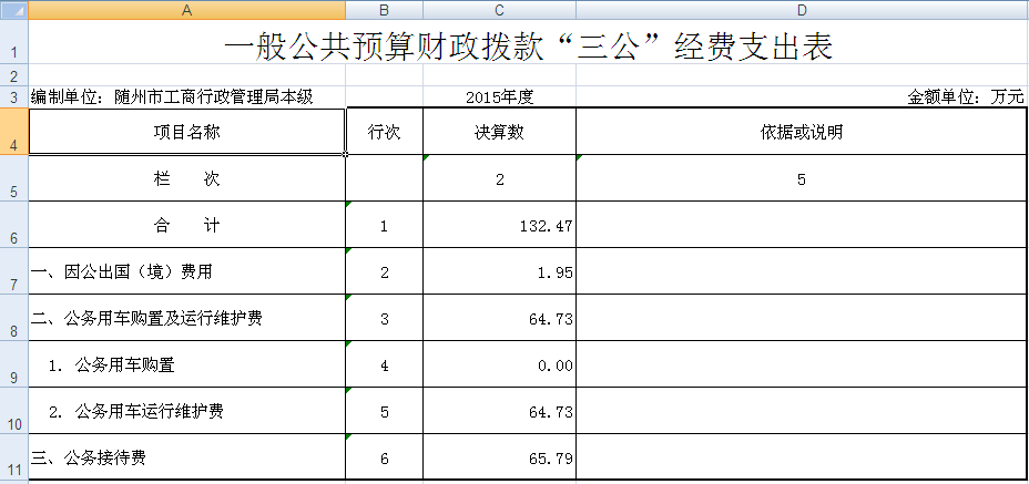 2015年“三公”經(jīng)費共支出132.47萬元,其中因公出國(境)支出1.95萬元,同比下降67.5%;公務(wù)用車運行及維護費支出64.73萬元,同比下降23.85%;公務(wù)接待費支出65.79萬元,同比下降23%。