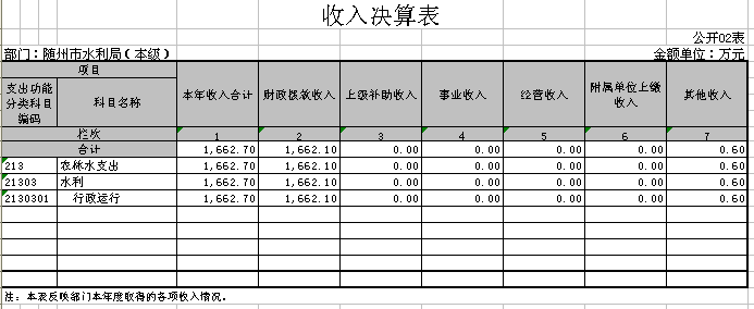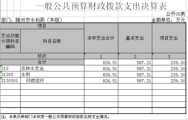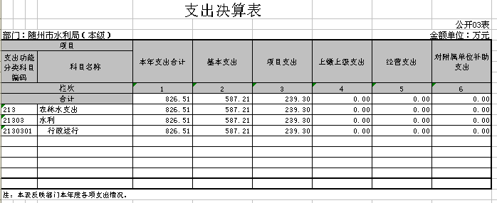 1、2016年度收支情況。隨州市水利局(本級)2016年部門收入1662.7萬元,其中財政撥款收入1662.1萬元,其他收入0.6萬元。部門全年支出826.51萬元,其中基本支出587.21萬元,項目支出239.3萬元;基本支出中工資福利支出386.52萬元,對個人和家庭補助支出116.69萬元,商品和服務支出74.88萬元,其他資本性支出9.13萬元。年末結轉結余836.19萬元。
