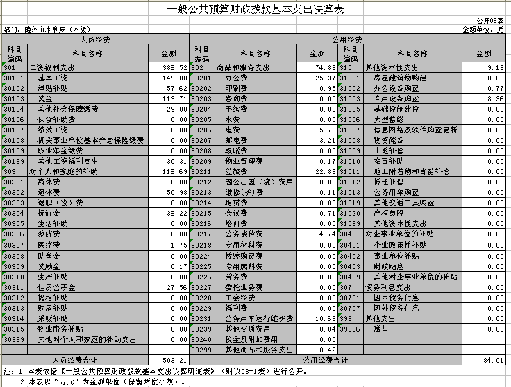 3、2016年度機關運行經費情況。隨州市水利局2016年度 機關運行經費支出84.01萬元,具體包括辦公費25.37萬元、印刷費0.95萬元、電費5.7萬元、郵電費3.21萬元、物業管理費0.17萬元、差旅費22.83萬元、維修(護)費0.11萬元、會議費0.71萬元、公務接待費4.74萬元、公務用車運行維護費10.63萬元、其他交通費0.04萬元、其他商品和服務支出0.42萬元、辦公設備購置0.77萬元、專用設備購置8.36萬元。