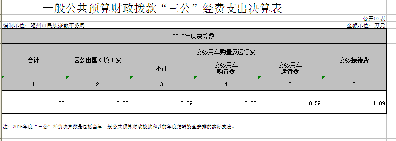 隨州市民宗局2016年度“三公”經費總支出16807元,比上年度減少44404元,“三公”經費開支具體明細如下: (1)2016年度市民宗局無因公出國(境)人員,故無此項經費支出。