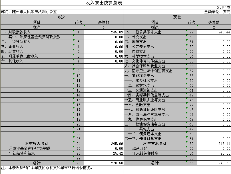 2016年度財政撥款收入270.5 萬元,其中當年一般公共預算財政撥款245.09萬元,政府性基金預算財政撥款0萬元,年初財政撥款結轉和結余25.42萬元。一般公共服務支出245.44萬元,結余25.06萬元。