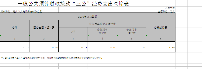 隨州市政府法制辦2016年度“三公”經費總支出4.03萬元,比上年度減少10.06萬元,“三公”經費開支具體明細如下: (1)公務用車運行費0.73萬元。與上年相比降少5.58萬元,主要是由4月份公車改革,原有的兩輛公務用車全部移交政府公車平臺。 (2)公務接待費3.3萬元。(國內公務接待55批次390人次,無外事接待),經費開支控制在年初預算范圍內,公務接待費比上年度減少2.68萬元,主要是2016年度市法制辦進一步嚴格了公務活動接待。 (3)2016年無因公出國(境)支出。