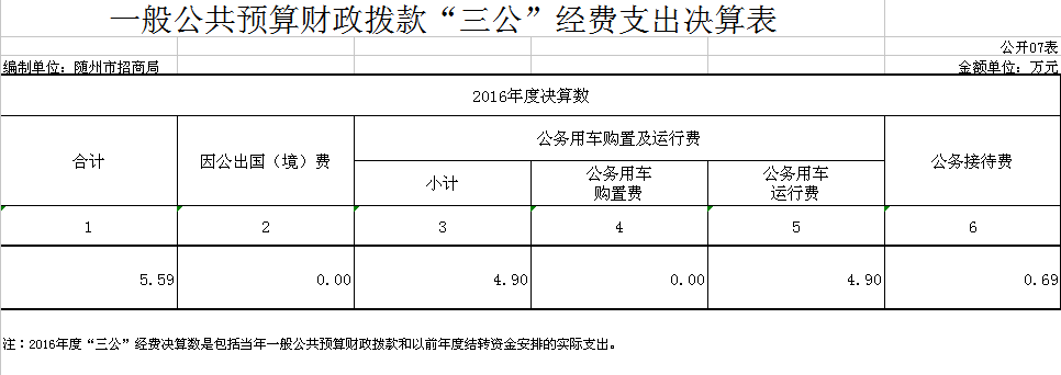 2016年度“三公”經費財政撥款決算5.59萬元,較上年減少0.46萬元。其中,因公出國(境)費0萬元,公務用車購置及運行費4.90萬元,減少0.61萬元,公務接待費0.69萬元,增加0.15萬元。主要是公務用車改革,境內招商活動增加。