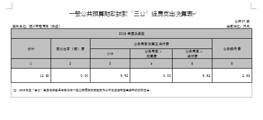 2016年“三公”經費支出12.6萬元,其中:公務接待費2.68萬元,公車運行費9.92萬元。比年初預算24.34萬元減少11.74萬元,公車改革后公車運行費減少是主要原因。2016年單位公務車1輛,未新購置公務車輛。2016年公務接待費2.68萬元,接待48批次,359人次。