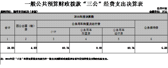 ??2016年,我局認真貫徹落實中央八項規定。公務接待費比去年降低了1.02萬元,公車運行費比去年降低了0.9萬元。參加省民政廳組織的因公出國活動,共1批次1人次,因公出國經費4.83萬元。