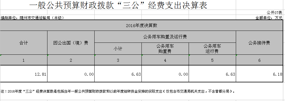 2016年度“三公”經(jīng)費(fèi)財政撥款決算12.81萬元,其中,因公出國(境)費(fèi)0萬元,公務(wù)用車購置及運(yùn)行費(fèi)6.63萬元,公務(wù)接待費(fèi)6.18萬元。