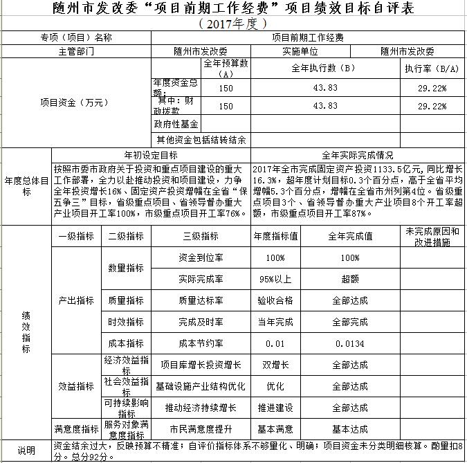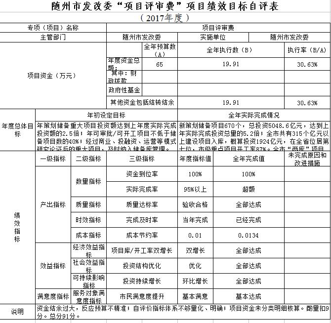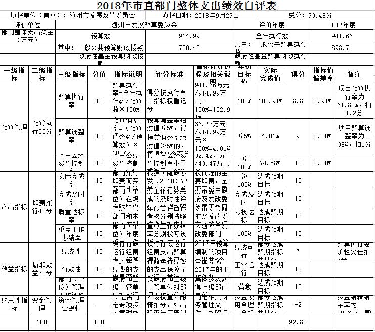 按照《市財政局關(guān)于2018年開展財政支出績效評價工作的通知》(隨財發(fā)〔2018〕16號)精神,市發(fā)改委2018年9月委托隨州正信會計師事務(wù)有限公司對全委6個項目和3個部門開展了支出績效評價工作。由于農(nóng)業(yè)資源區(qū)劃委員會辦公室和節(jié)能監(jiān)察中心財務(wù)支出由市發(fā)改委財務(wù)科集中統(tǒng)一管理,財務(wù)核算只有人員工資支出,沒有項目支出,因此,在此次評價中未對兩個二級單位單獨做績效評價。