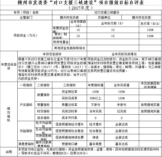 2017年,我委共有出國經(jīng)費、信用體系建設(shè)、對口支援三峽建設(shè)、項目前期費、項目評審費、信息化建設(shè)等6項項目支出。由于出國經(jīng)費、信息化建設(shè)支出主要用于機關(guān)運轉(zhuǎn),信用體系建設(shè)主要是建設(shè)信用體系信息平臺,因此按照“資金量較大、代表性較強”的原則,我委從本級預(yù)算安排項目中選擇對口支援三峽建設(shè)、項目前期費、項目評審費等3個項目開展支出績效評價工作,總計評價資金225萬元。從評價結(jié)果看,3個評價項目平均得分92.6分,最高得分95分,最低得分91分。被評價項目總體績效目標(biāo)明確,決策依據(jù)充分,資金分配科學(xué)合理,項目管理較規(guī)范,項目完成良好,基本達(dá)到了預(yù)期效果。