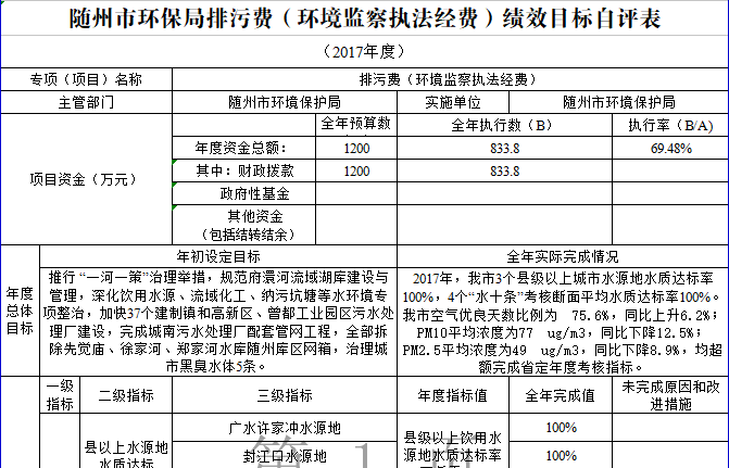 排污費安排的支出項目績效自評:項目全年預算數為1200萬元,執行數為833.8萬元,完成預算的69.48%。主要產出和效果:一是空氣質量省定目標超額完成;二是水環境質量達到省考核要求;