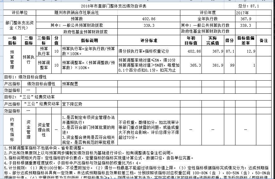 通過對我單位2017年度部門整體支出進行績效評價,經(jīng)評價,整體支出績效評價總分為87.1分,評價結(jié)果類型為A,績效評價結(jié)果級別為優(yōu)。具體情況如下: